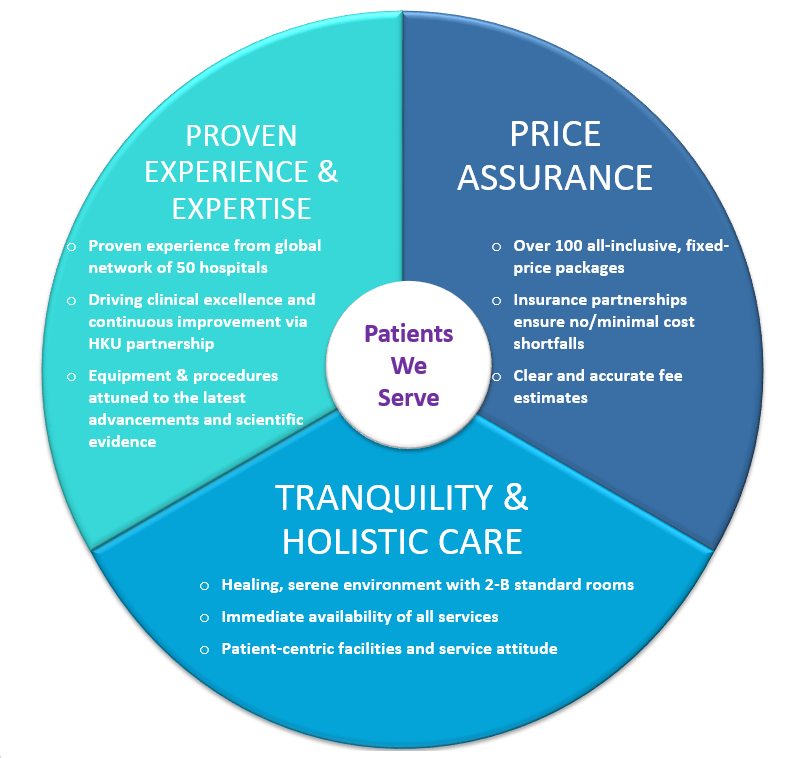 Over the past six months since opening, we have been listening to opinions, suggestions and expectations from patients, doctors, business partners, stakeholders and staff. In reviewing these views, it has become clearer that we needed a more clearly-defined proposition to help us reinforce our position as a high -quality, competitive healthcare provider. In essence, Proven Experience & Expertise, Price Assurance, Tranquility & Holistic Care are the three unique qualities that differentiate from others. This new positioning in turn sets GHK’s strategic direction in terms of our target segment, service focus and unique offerings.