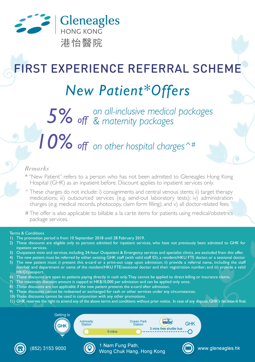 With our clinical expertise, excellent service and beautiful environment, GHK is keen to encourage more new patients to try out our services. From 10 September 2018 to 28 February 2019, GHK staff and doctors can refer patients who are first-time GHK clients to enjoy a 5% discount on all-inclusive medical packages and maternity packages. Patients referred under this scheme will also be entitled a 10% off on other hospital charges.